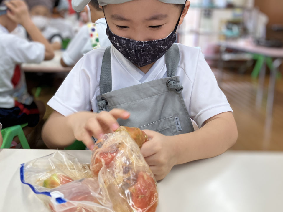 実際にトマトを袋に入れて手でつぶす体験では、小さな手を一生懸命に動かしながら、夢中な姿が見られました。
