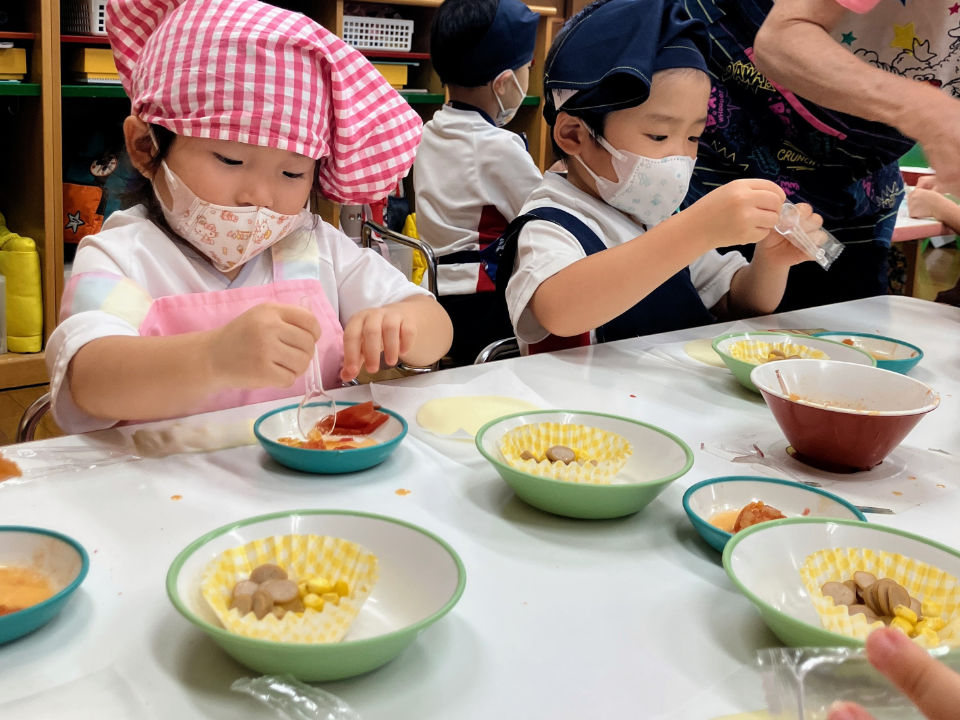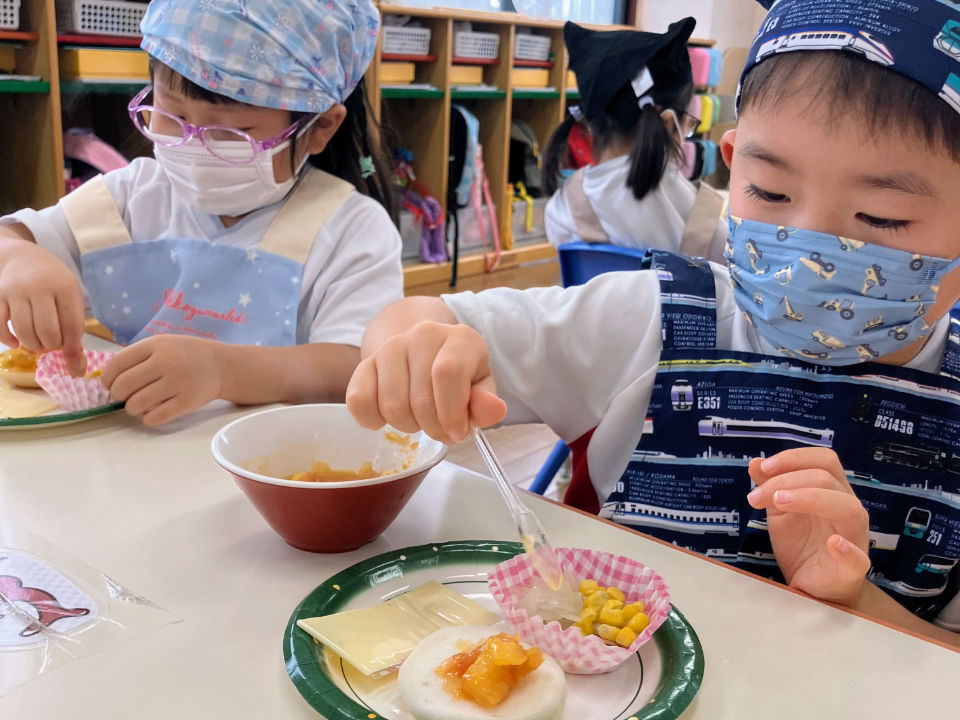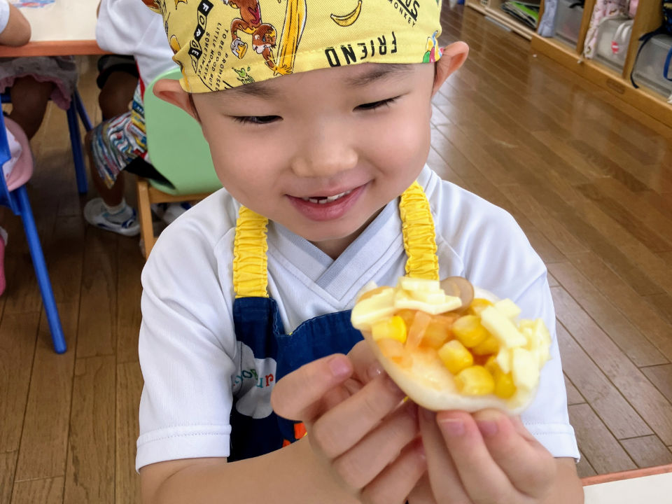 いました。「色が変わったよ」「おいしそうなにおいがするね」と教えてくれる姿が印象的でしたよ。ピザが完成すると大喜び。みんなおいしく完食することができました。