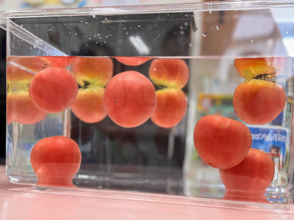 ピザに使うトマトを水槽に入れてみると・・・「沈んでるトマトと浮いているトマトがあるね!」と子どもたちは大発見。