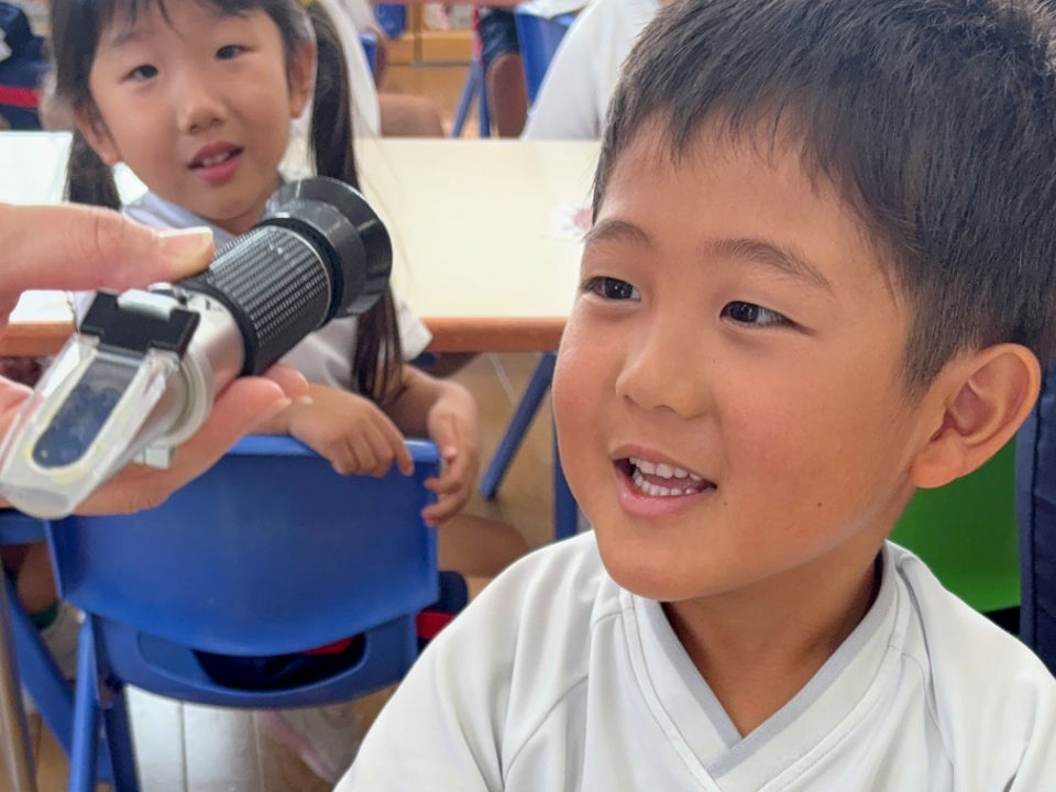 さらに糖度計を使って甘さを調べてみると、なんと予想とは違って沈んだトマトのほうが数値が高いことがわかりました!「数字が大きいから甘いんだね!」と‘’数字‘’で比べる面白さにも触れられました。