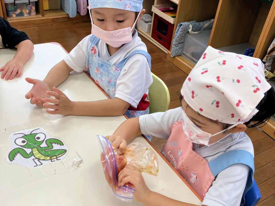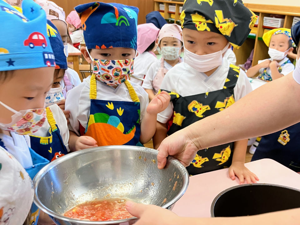 「赤から白っぽくなってきたね」「グチャグチャって音がするよ」と手の感触や音、色の変化に大喜び。お鍋でケチャップを作ると「いいにおい~楽しみだね!」と期待がふくらみました。