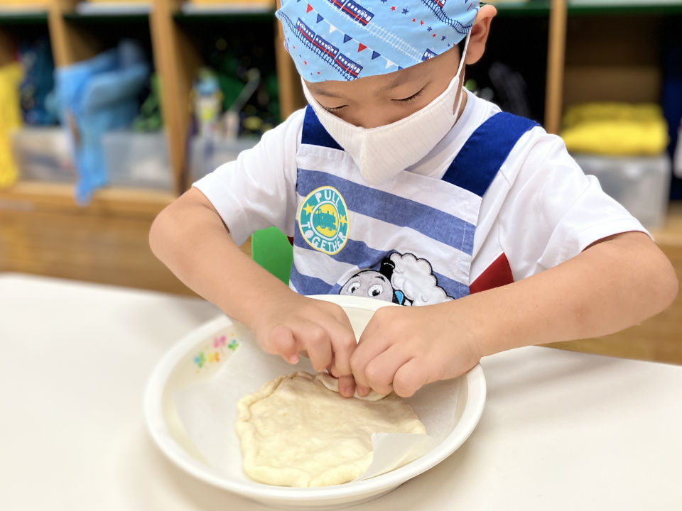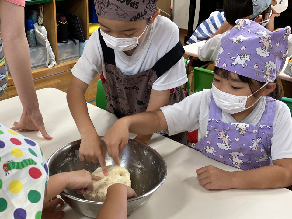 生地作りでは、発酵前後の生地を比べてみると「すごく大きくなってる!」「フワフワしているね」「においが納豆みたい!」と子どもならではの発見に笑顔が広がりましたよ。