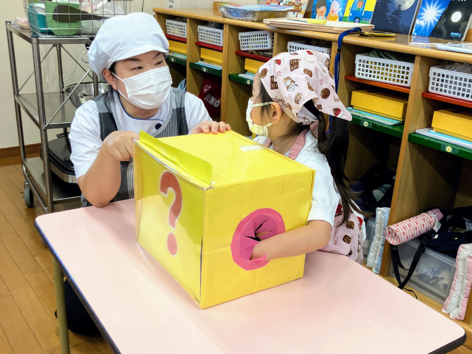 ?ボックスに入れたトマトを手で触ってみると、「固くて丸いよ」と一生懸命に伝えてくれる子もいましたが、なかなか言葉にするのは難しくて「うーん、わからない」と首をかしげる姿も。