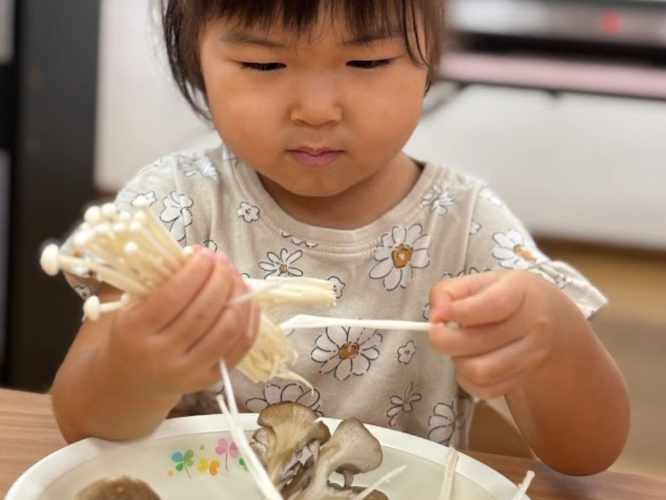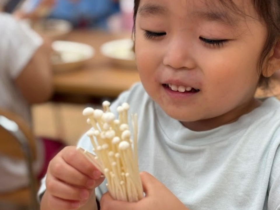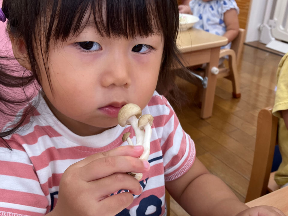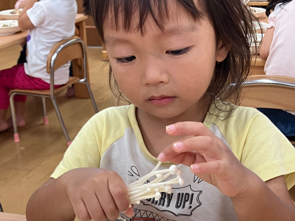 しめじのかさを「ボタンみたい!」と並べたり、えのきを割いて楽しんだりと、きのこの違いに気づく姿も見られました。